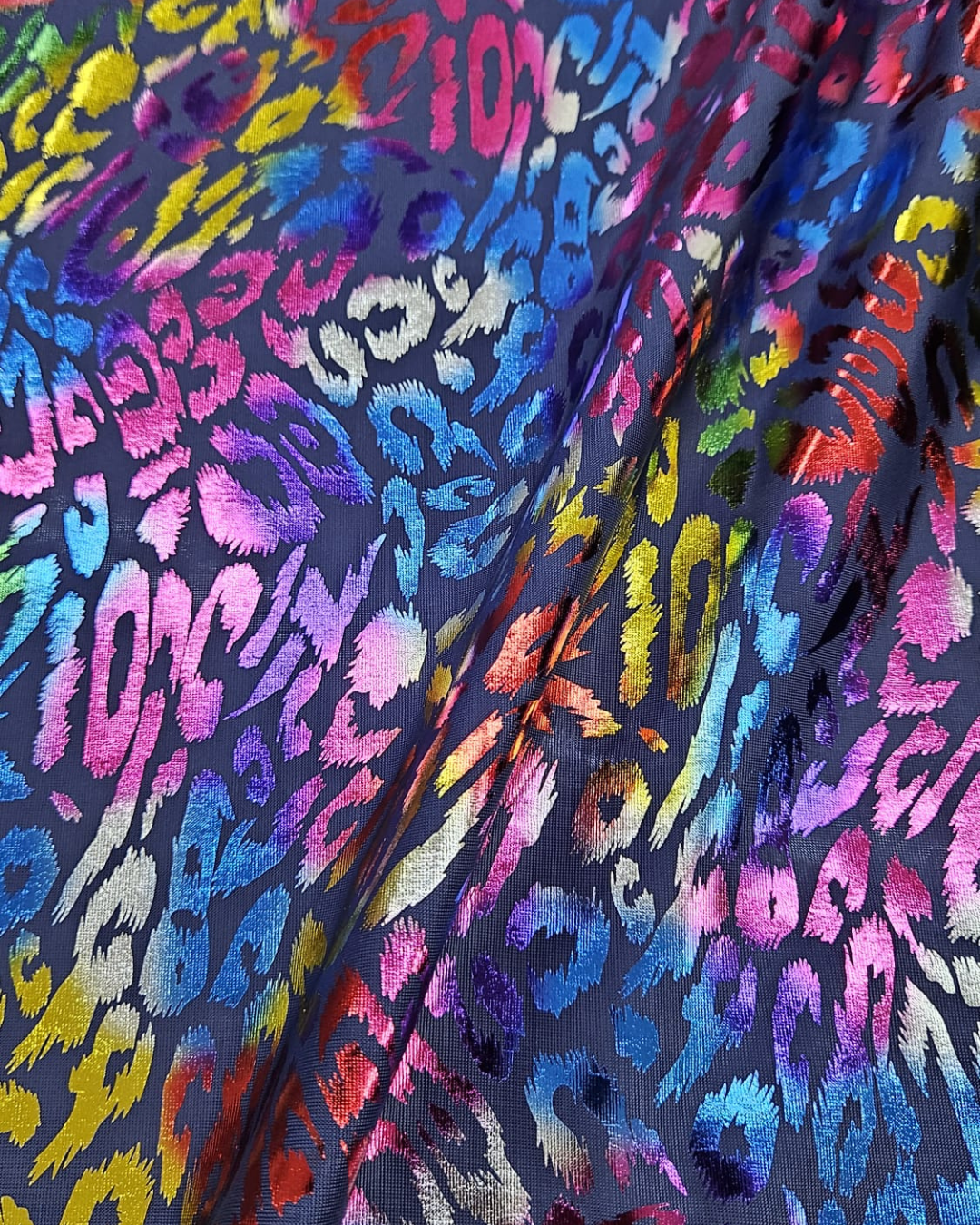 Esta tela presenta un estampado abstracto tipo animal print con acabado metalizado en tonos tornasolados —azules, fucsias, verdes, dorados y violetas— sobre fondo oscuro, creando un juego de reflejos intenso que cambia con la luz y el movimiento. El resultado es un efecto visual dinámico, moderno y muy llamativo.