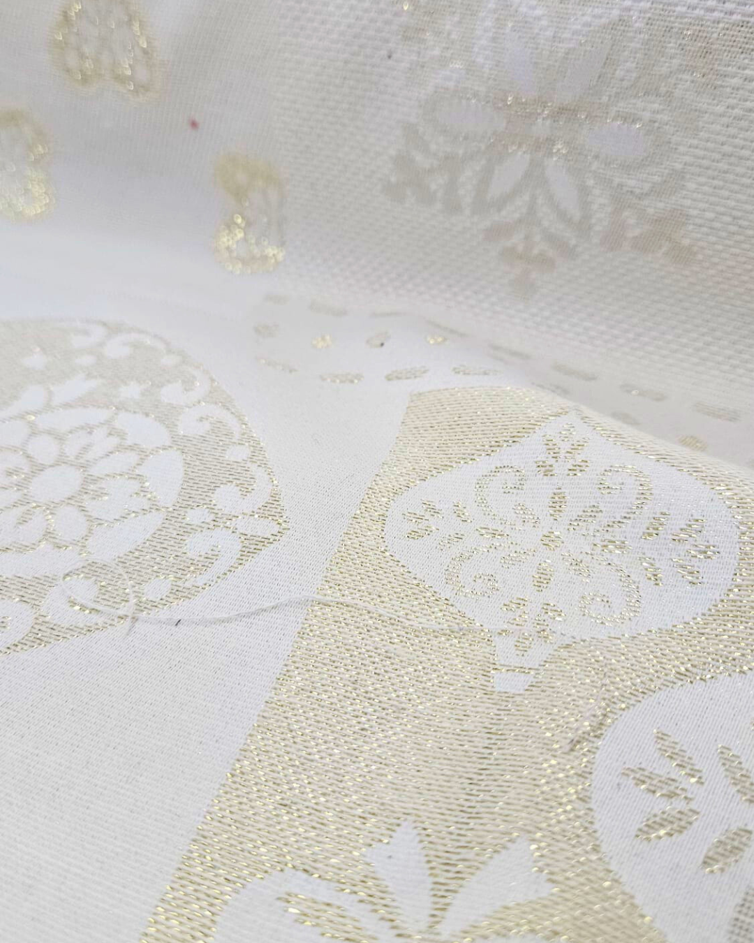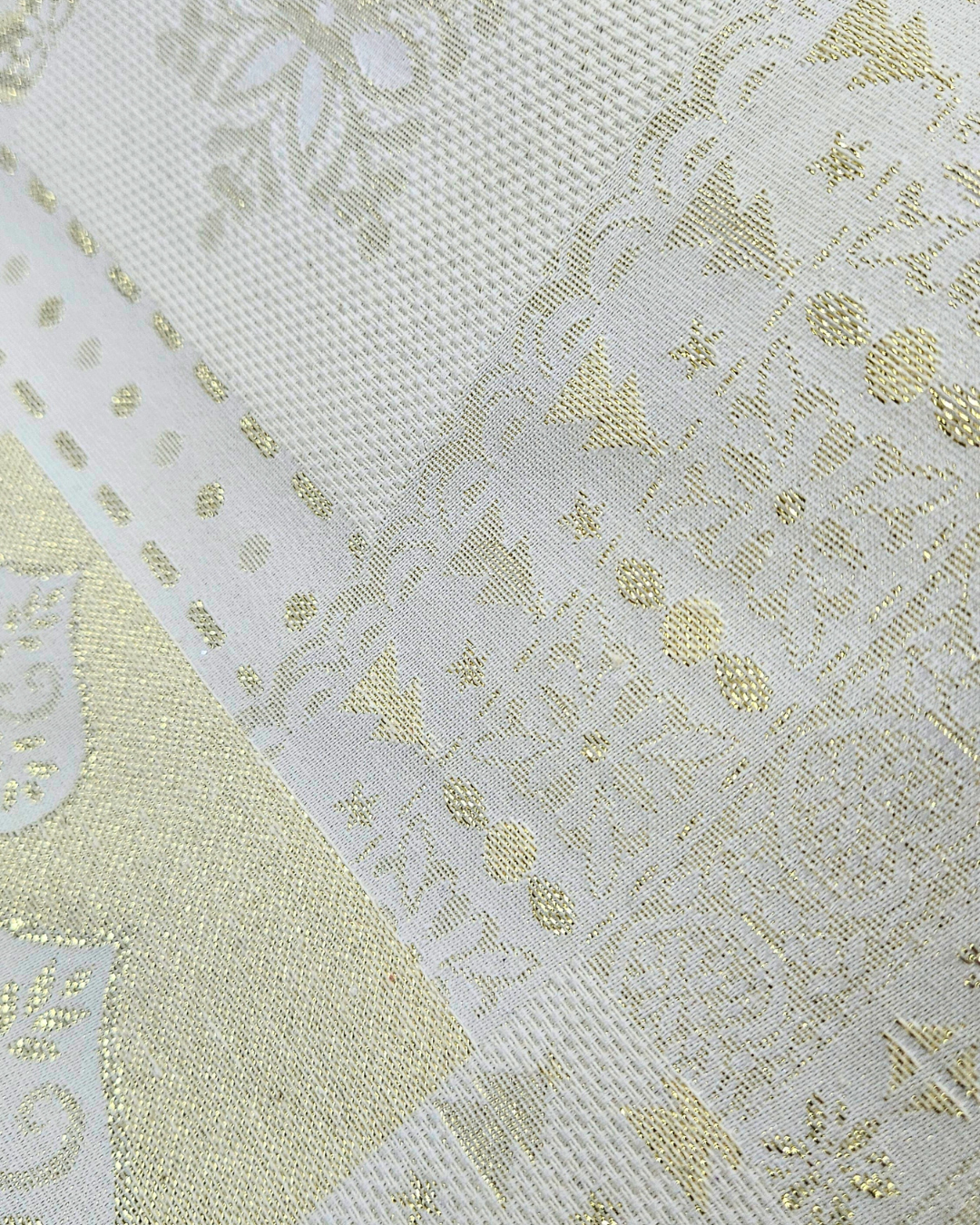 Este mantel navideño en blanco con hilos de lúrex dorado ilumina cualquier mesa con un brillo elegante y discreto. Su diseño combina la pureza del fondo blanco con delicados motivos dorados que reflejan la luz, creando un ambiente festivo lleno de encanto.