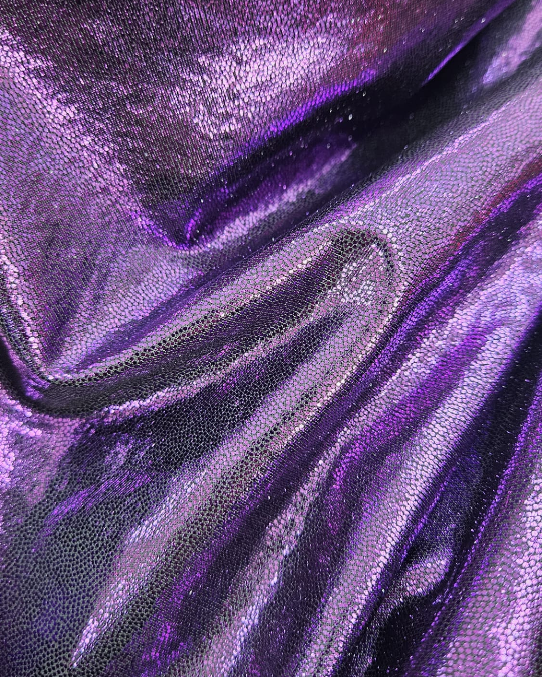 Aporta brillo, personalidad y un aire futurista a tus proyectos con el punto estampado metalizado de lámina foil “Escamas Tornasol lila ”, un tejido impactante diseñado para creaciones que buscan destacar.